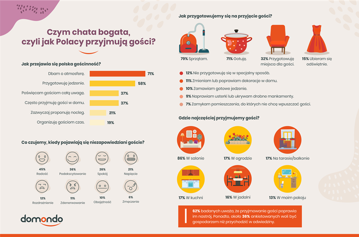 Wizyty gości Polacy traktują poważnie, a większość gospodarzy odpowiednio się do tego przygotowuje – 79% badanych sprząta wcześniej mieszkanie, a 71% przygotowuje posiłek. Co trzecia osoba szykuje wcześniej miejsca do spania, jeśli planowany jest nocleg. Oprócz tego 15% ankietowanych przed odwiedzinami odświętnie się ubiera, a 11% dba o odpowiednie dekoracje, np. zapala świeczki lub kupuje świeże kwiaty. Aby wyznaczyć granicę prywatności, 27% respondentów zamyka przed gośćmi drzwi do niektórych pomieszczeń (w szczególności do sypialni).